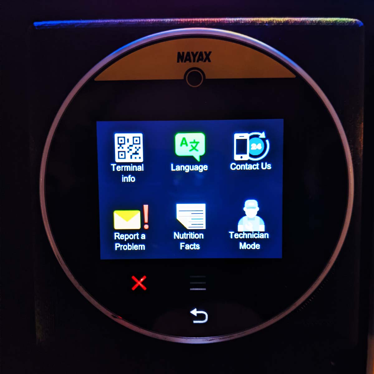 The Nayax reader should still respond to user requests at this point. Push the menu button on the front of the Nayax unit, as indicated by 3 lines. You should be presented with a screen with a few options. look for the top left button here, marked 'Terminal Info' and push it.