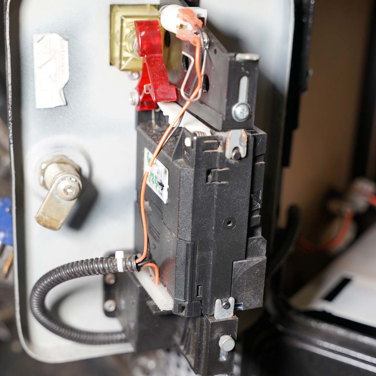 The validator fits into a plastic cradle, attached to the back of the games coin door.