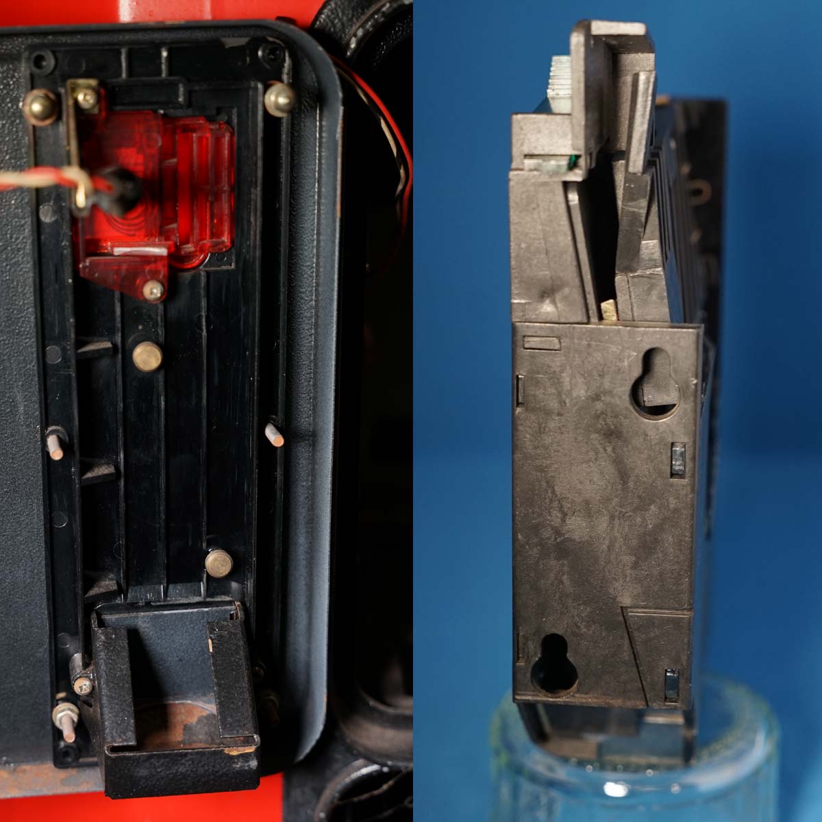 The C220 has a large, usually clear plastic, release slide on the top of the validator. It is sprung loaded and is designed to slide backwards, away from the coin door.